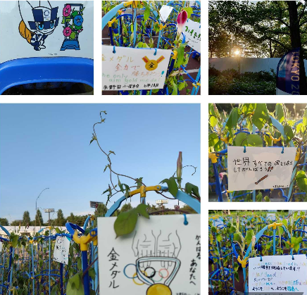 球場には、こどもたちによる応援メッセージのアサガオと青い紫陽花ロードが美しく彩られています。