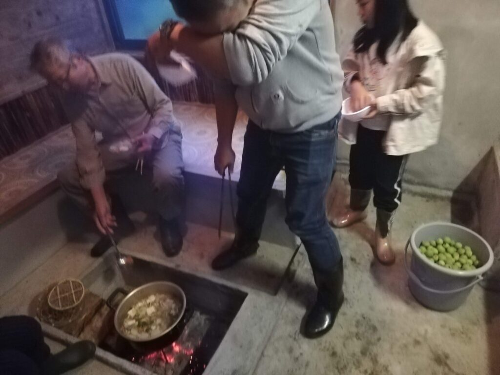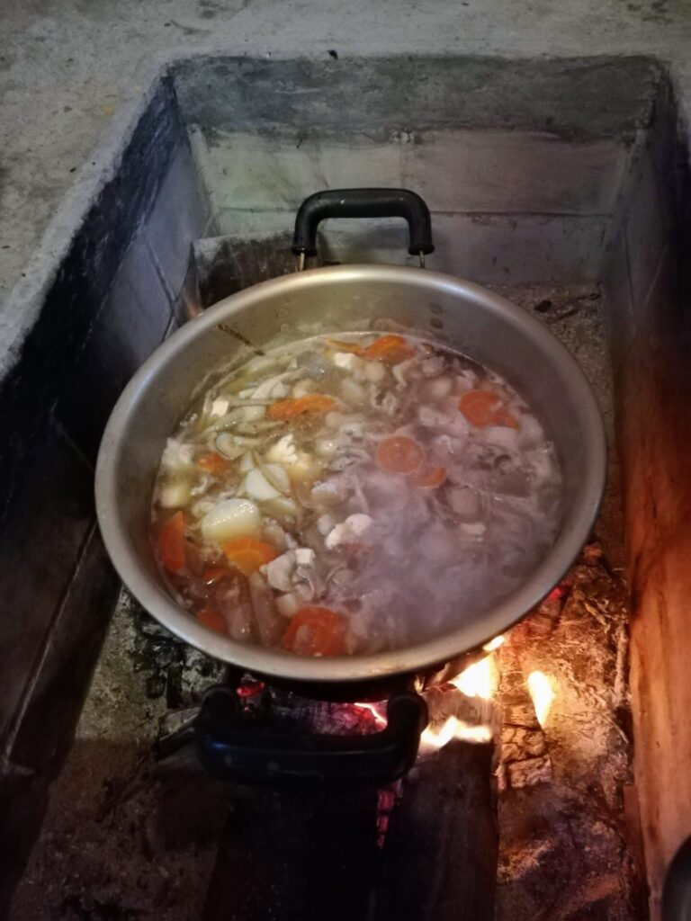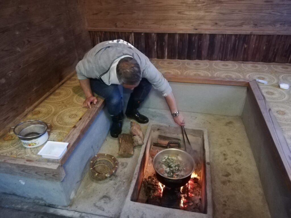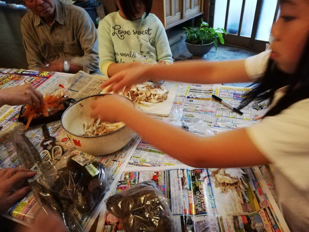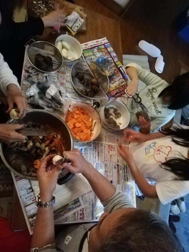 今回の夕食は、参加者の満場一致で芋煮です。みんなで準備し、囲炉裏で調理しました。