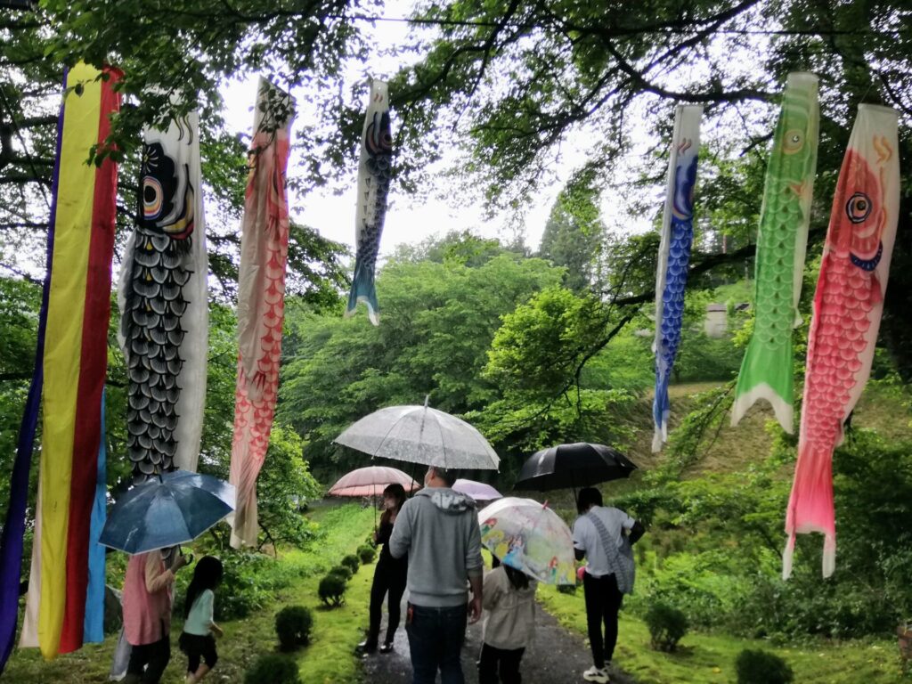今回は、旧暦端午の節句を祝うということもイベント内容のため、開催農家で事前に鯉のぼりを泳がせておきました。その下を通って蓮華畑に向かいました。