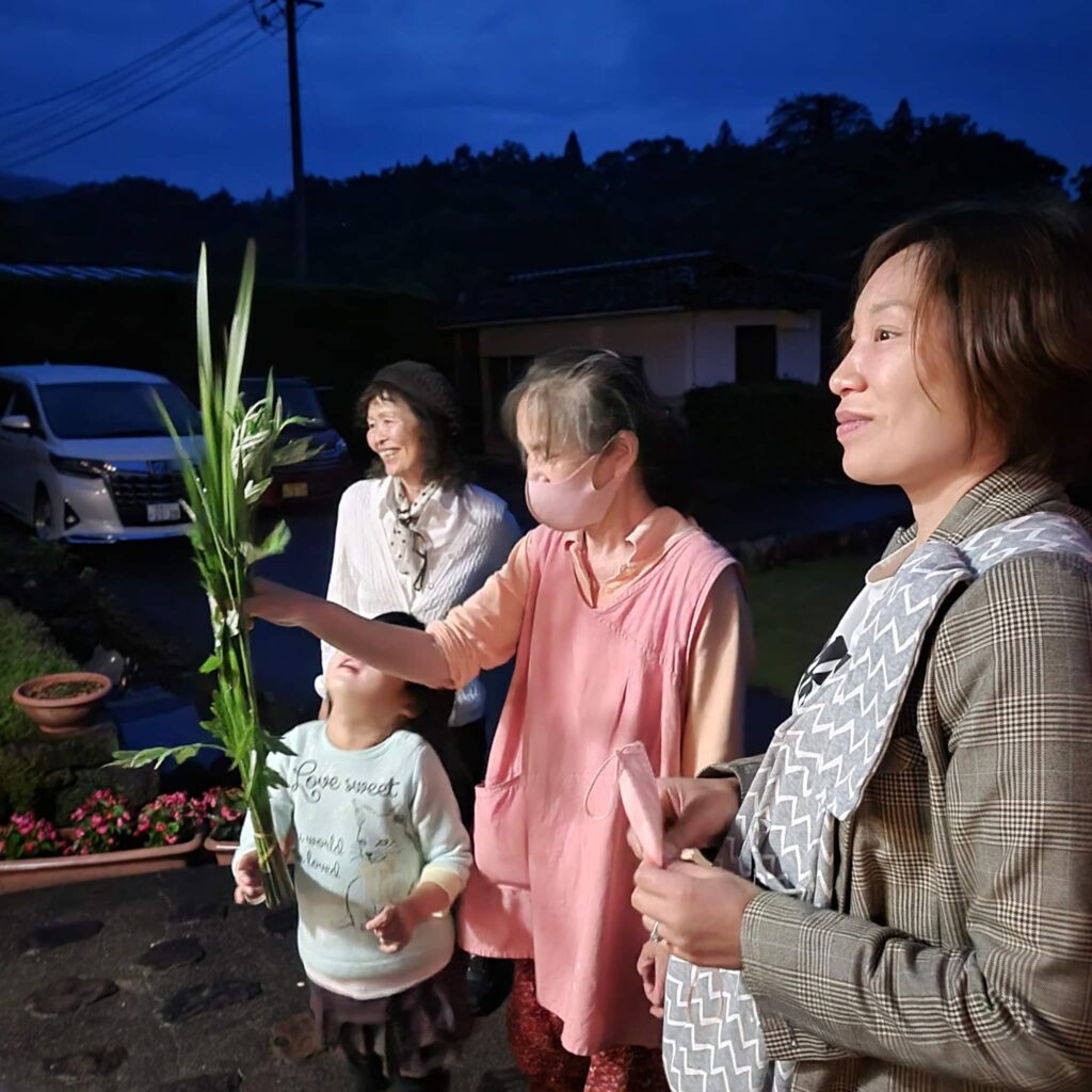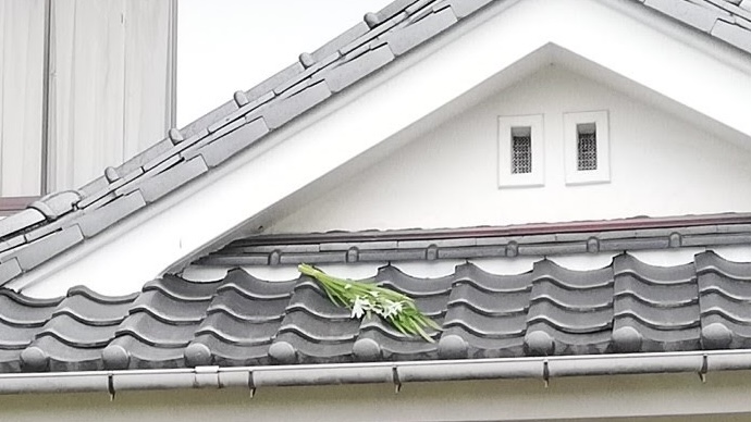 屋根の上に菖蒲とよもぎを束ねたものを投げ上げる儀式をみんなで行いました。魔除けや火除け、厄払いの効果があるそうです。